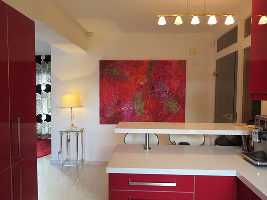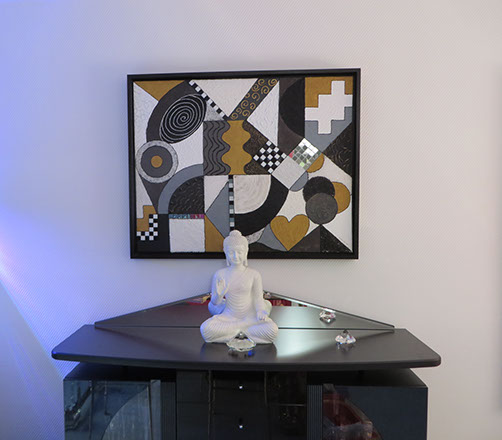 Gerne gestalte ich individuell und nach Ihren Wünschen Acrylgemälde und Collagen für Wohn- und Geschäftsräume, Praxen, Büros oder Empfangsräume - auch angepasst an die Farben und Formen des jeweiligen Raumdesigns.